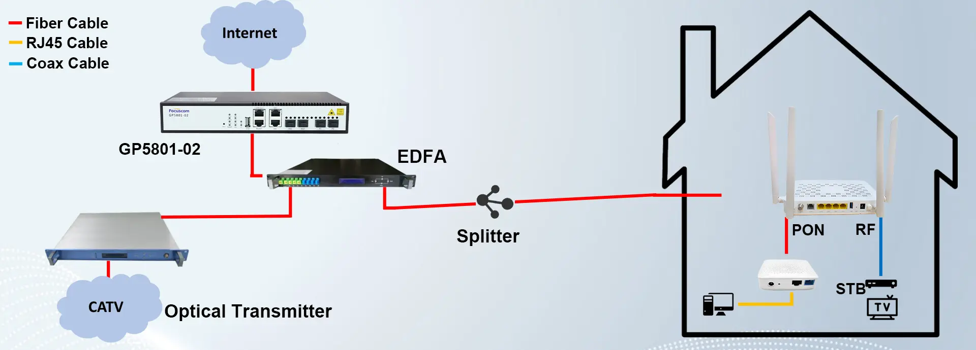 This is sometimes called an RF overlay — where RF (radio frequency) TV signals are carried alongside the PON optical signal on the same fiber infrastructure, then separated at the ONU and output through the dedicated CATV port.