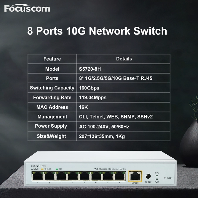 Don't let a slow switch hold your business back. The Focuscom S5720-8H offers the perfect balance of performance, management, and value.
