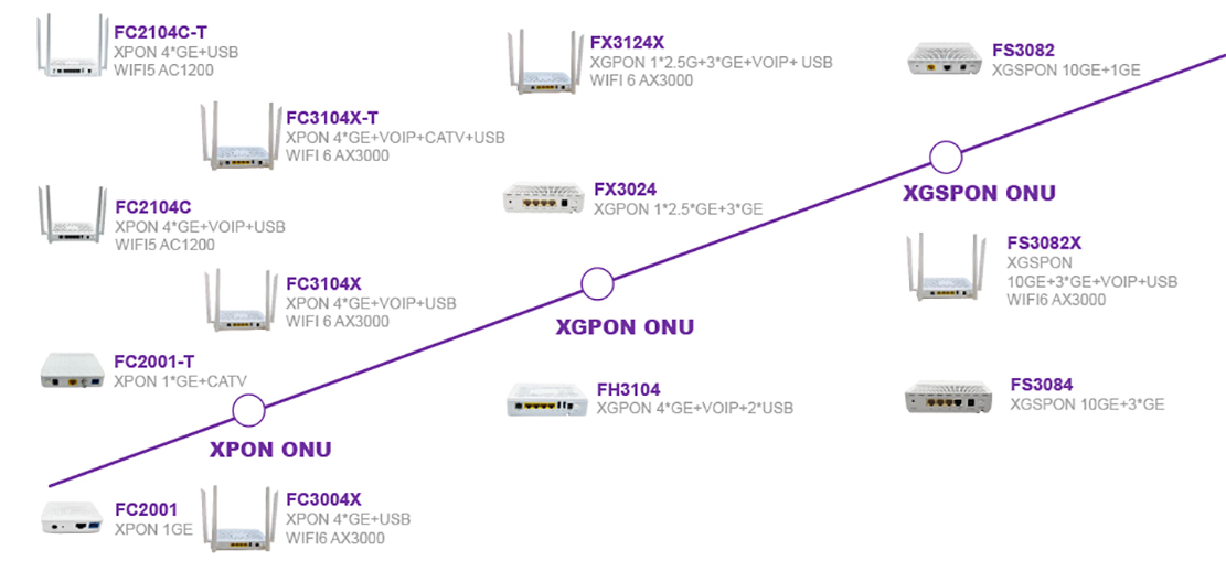 FC3004X is a dual band WIFI6 AX3000 XPON ONT, designed for FTTH applications. It has 1*XPON port for upstream, 4*GE port for downstream user connections.