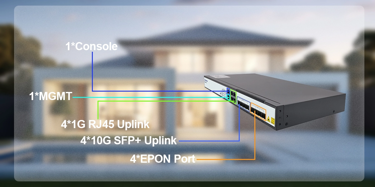 4*EPON Port, 4*10/100/1000M Base-T 4*1000M Base-X SFP/4*10GE SFP+ |