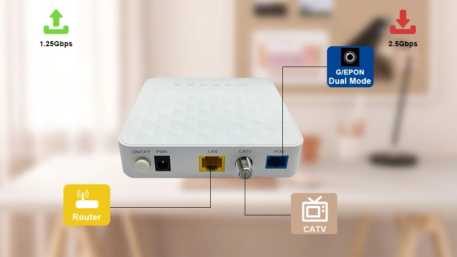 | Interface Specs | GPON: upstream 1.25Gbps/downstream 2.5Gbps EPON: upstream 1.25Gbps/downstream 1.25Gbps Coverage Range: 20KM Receiver sensitivity: -8~ -28dBm Transmit optical power: 0.5dBm~+5dBm |
