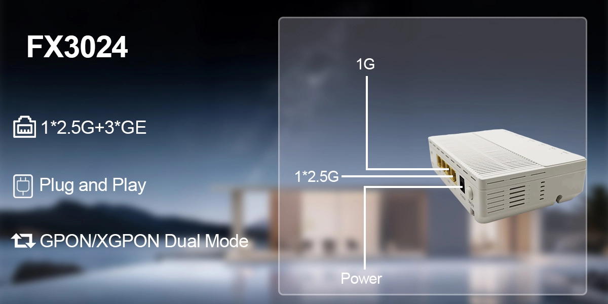 | FX3024 | 1*2.5G+3*GE *LAN+1*USB 3.0+1*SC/UPC (SC/APC) XGPON ONU | ||