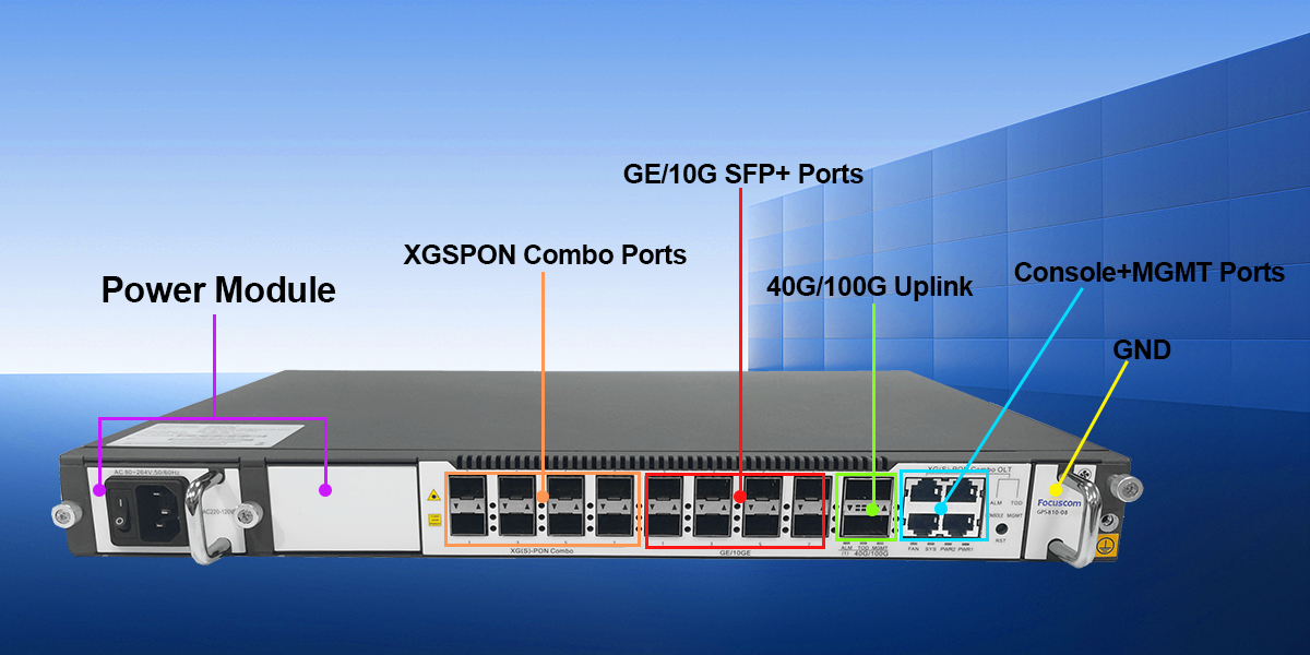 8*XG(S)-PON/GPON Combo port, 8* GE/10GE SFP + 2*100G QSFP28 |