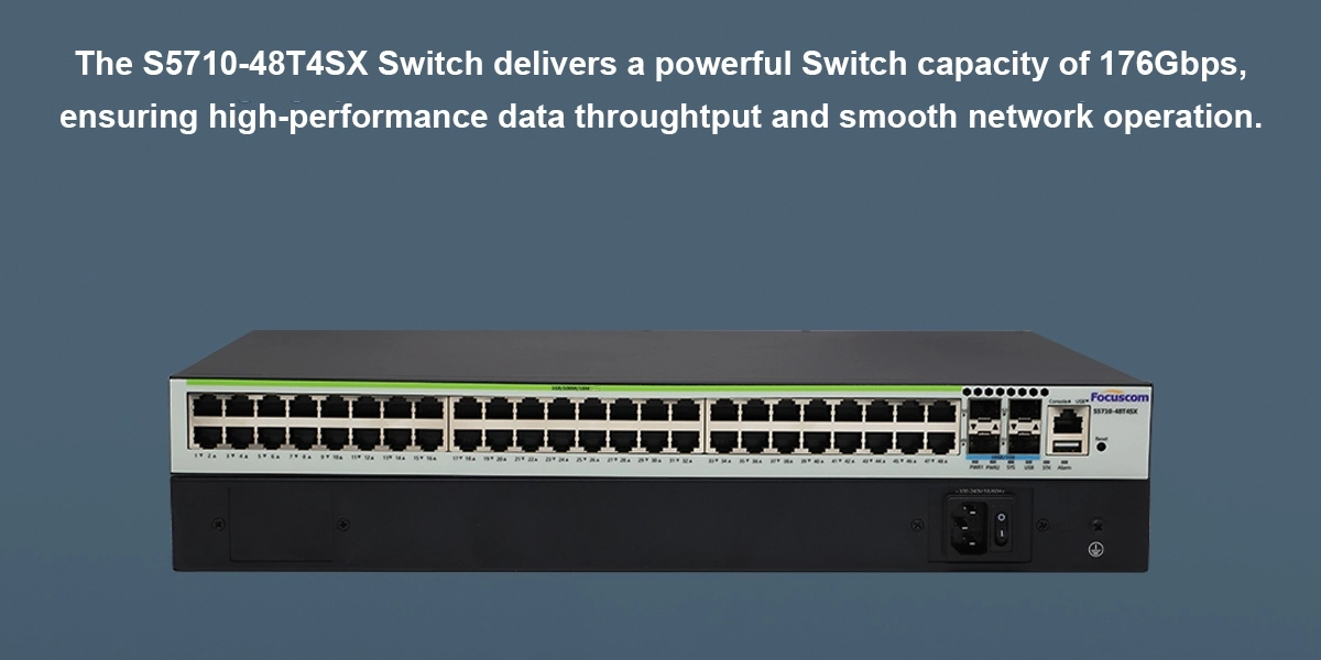 S5710-48T4SX L3 Managed Gigabit Switch. 48x 10/100/1000M RJ45 ports, 4x 10G SFP+ uplinks. 176Gbps switching capacity. Built-in smart cooling. Ideal for enterprise networks to connect PCs, printers, and cameras.