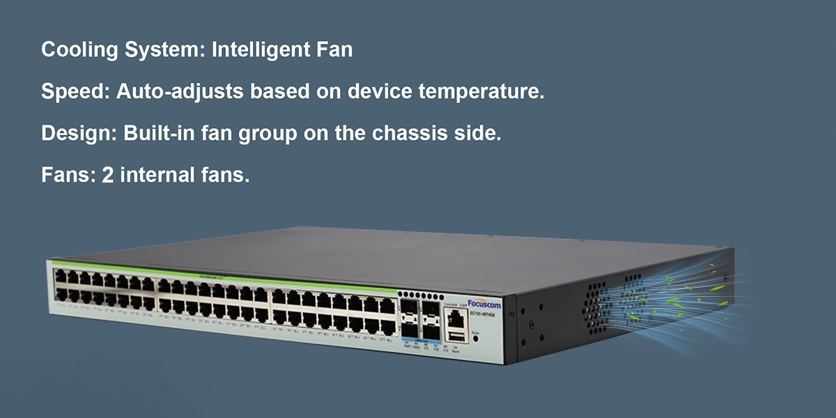 The chassis includes a built-in fan group with 2 high-speed fans that automatically adjust their speed based on the device's temperature, ensuring reliable operation and energy efficiency.