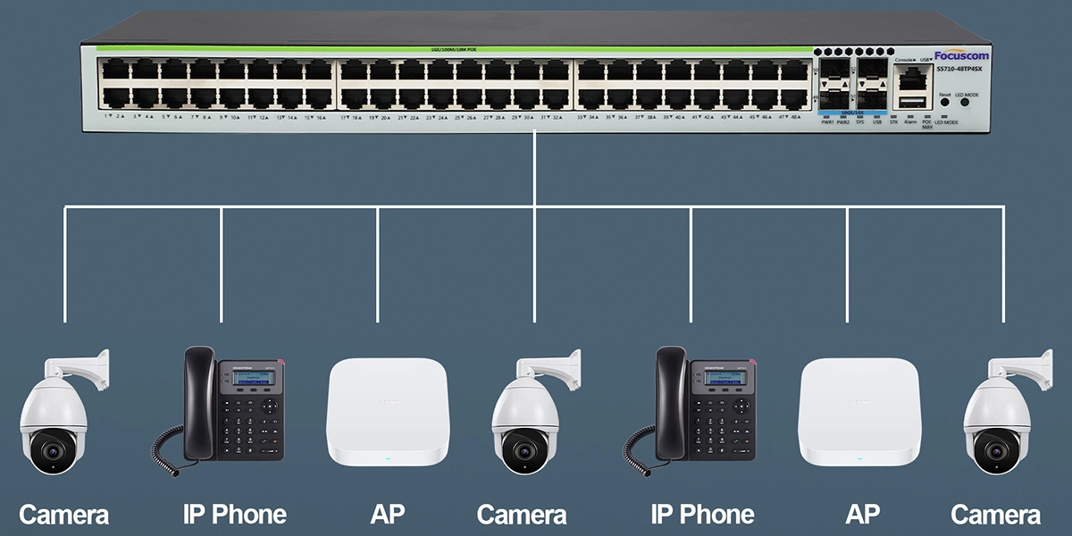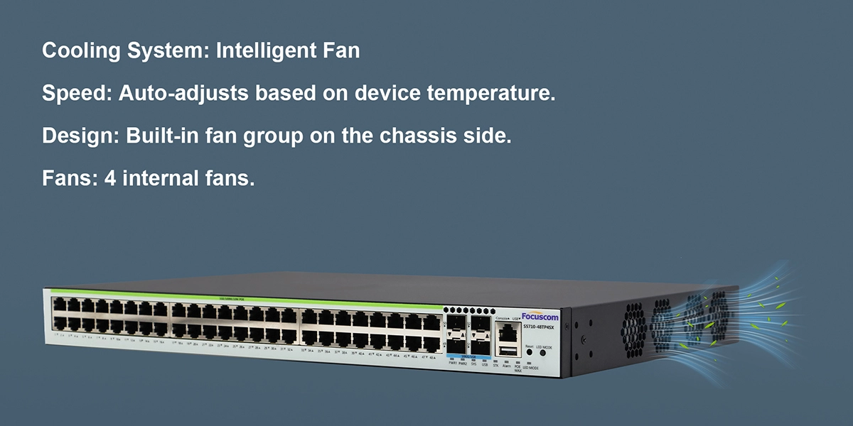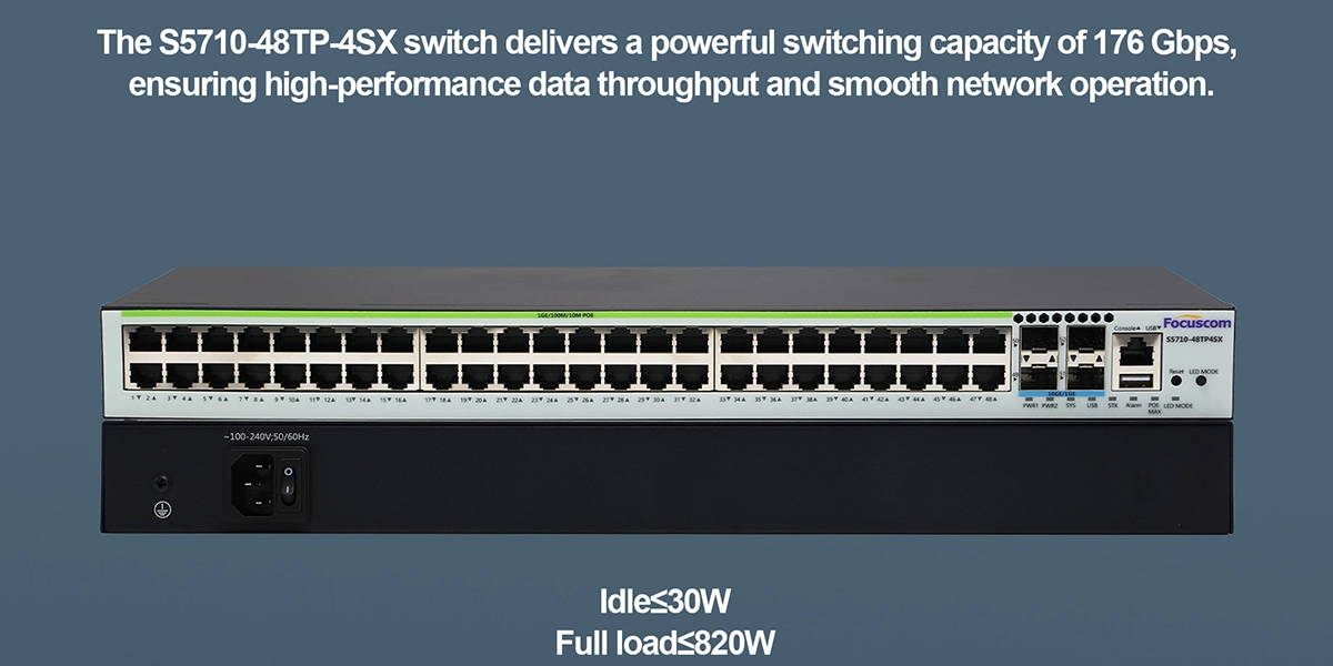 Power over Ethernet (PoE+): All 48 Gigabit ports support IEEE 802.3af/at, with a total PoE budget of 760W, providing up to 30W per port to power devices like PTZ cameras, high-speed APs, and IP phones.
