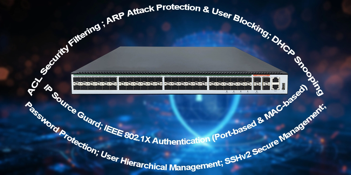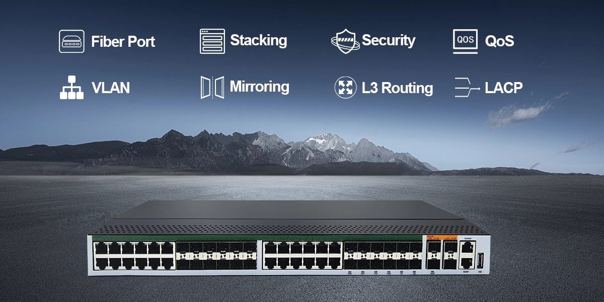 | Interface | 48*100/1000M Base-X, 4*1000M/10G Base-X optical ports | System Management | Supports CLI based on RS232 serial port, Telnet and SSHv2 Supports WEB-based configuration operation management, supports SNMP V1/V2/V3 Supports remote upgrade or device management via FTP and TFTP |
