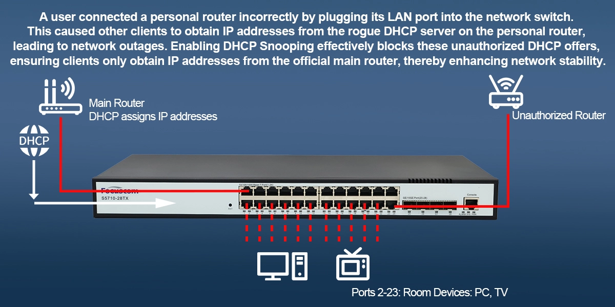 Protect your network from unauthorized DHCP servers and resulting outages by enabling the powerful DHCP Snooping feature. This security function effectively blocks DHCP offers from rogue devices, like a misconfigured personal router, ensuring clients only obtain legitimate IP addresses from your official main router.