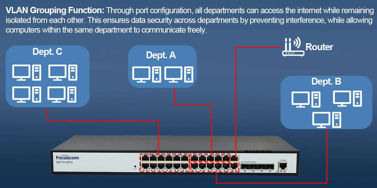 Enhance departmental data security with robust 802.1Q VLAN support on the S5710-28TX. This managed switch allows you to segment your network into secure virtual LANs, ensuring departments remain isolated from each other to prevent data interference while enabling seamless communication within the same group and internet access for all.