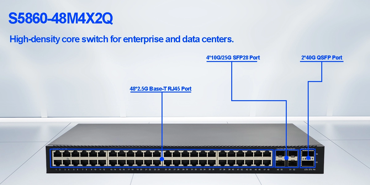 | S5860-48M4X2Q | 48*10/100/1000M/2.5G Base-T RJ45 Port; 4*10G/25G SFP+ Port; 2*40G QSFP Port |
