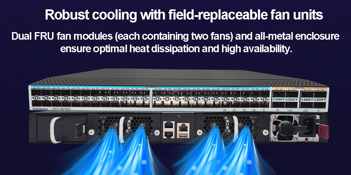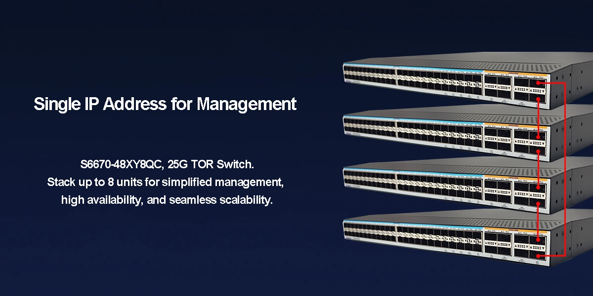 S6670-48XY8QC is a next-gen L3 switch with 48x10/25G SFP28 + 8x40/100G OSFP28 ports. Offers wire-speed L2/L3, VLAN/ACL/Q-in-Q, dual-FRU PSU, and elastic stacking. Ideal for data center/core/enterprise networks.